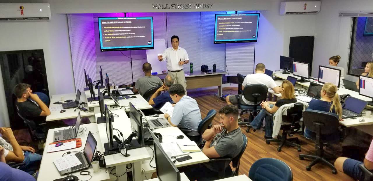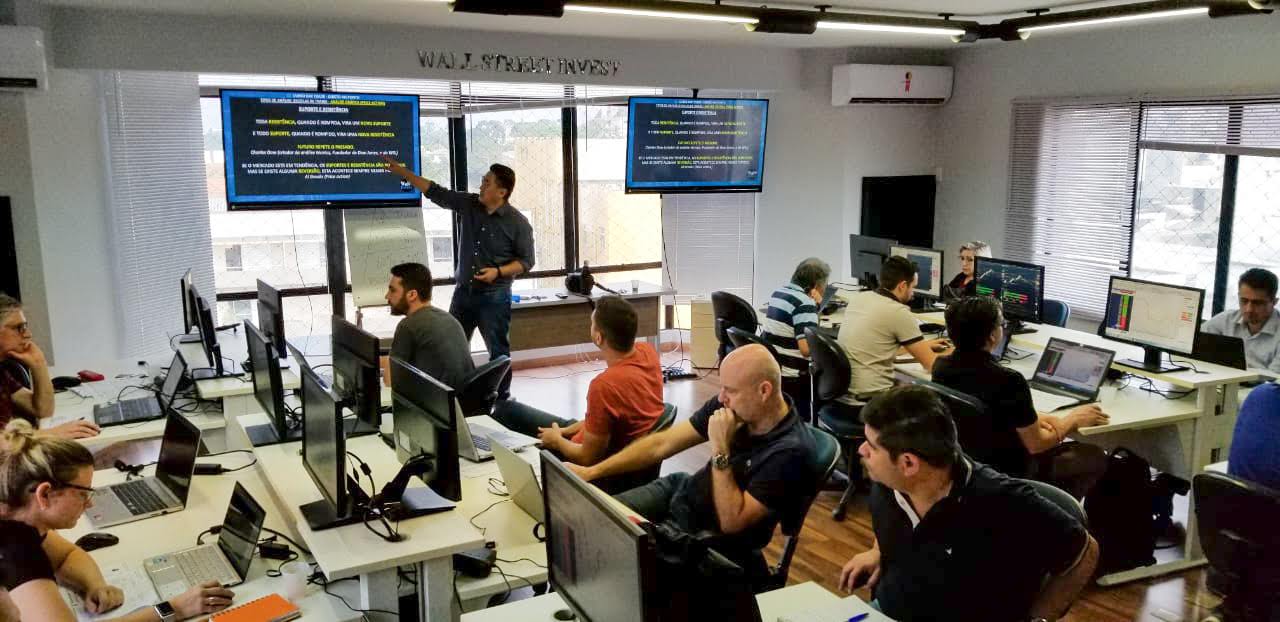 - No dia do curso, liberamos um ambiente exclusivo para os alunos ficarem durante o dia para operar, tirar dúvidas e fazer Network com outros alunos e traders (09:00 ao 12:00 e 14:00 às 18:00). Verificamos os alunos que ficaram durante o dia, tiveram maior aproveitamento durante o curso.
